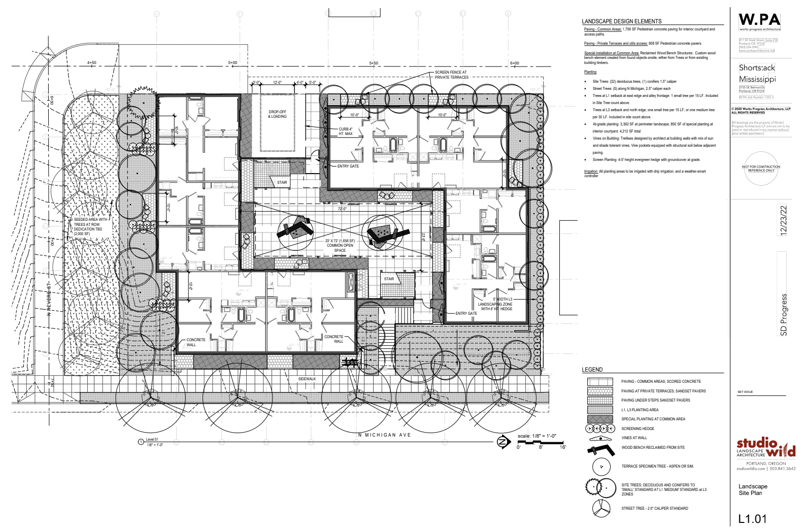The project includes construction of a new 30,000 sf, 4-story residential development, consisting of 36 units. With a goal to increase missing middle housing, a combination of 1-bed, 2-bed and 3-bed dwellings will be provided, as well as a targeted mix of MFI affordability. The development is designed with two buildings organized around a central courtyard and accessed via open air balconies and stairs. A partial basement accessed off N Michigan Ave houses shared laundry, bike storage, and trash, along with a variety of utility support spaces. The ground floor consists of nine units, surrounded by a variety of active outdoor spaces, providing both communal and private areas for residents. The remaining three floors are all dwelling units. Please see the site plan for more information.