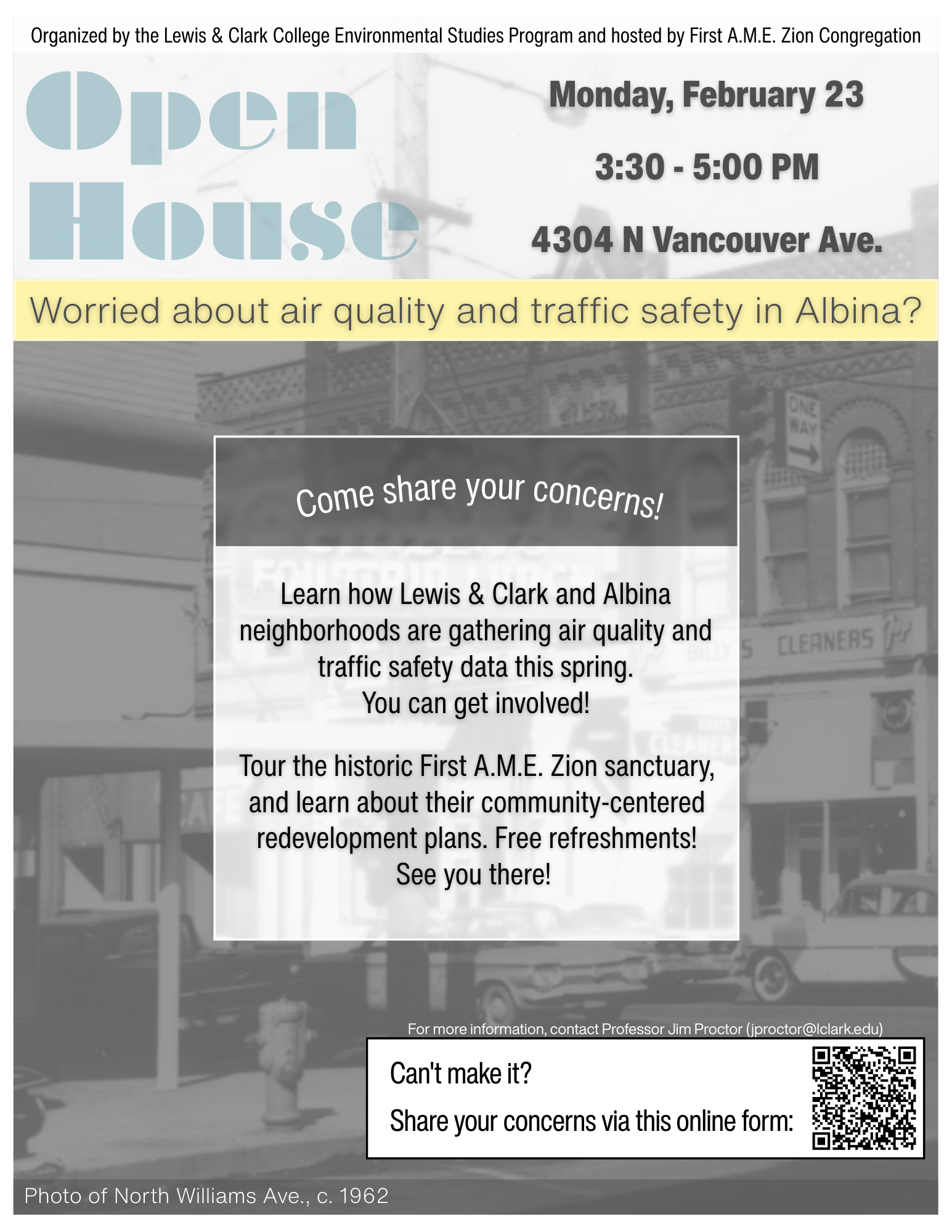 "Can't make the Feb 23 gathering? If you live, work, or regularly visit this area, feel free to complete this online form [QR code] to share your air quality and traffic safety concerns."